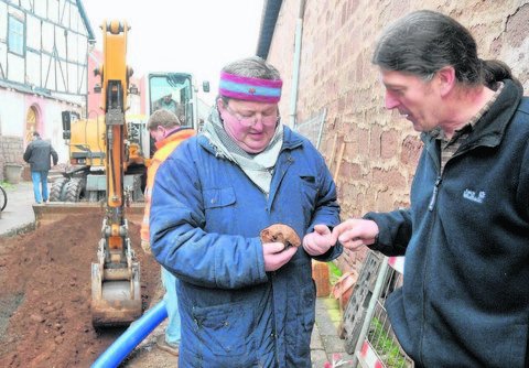 KELBRA/MZ. Die Straßenbauarbeiten in der Langen Straße bringen weitere interessante archäologische Funde ans Tageslicht. Aus einer Skizze in der Chronik der Stadt Kelbra aus dem Jahr 1900 wusste man, dass im Straßenbereich vor der ehemaligen Weinkelterei Heller ein Stadttor, dass so genannte Seigertor, gestanden hat. Der Stadtchronist und ehemalige Bürgermeister Friedrich Lehmann (1855-1903) vermerkte in der Chronik: "Das Stadtthor in der Langenstraße nach Altendorf zu, das Seigerthor genannt, kam am 15. Januar 1817 zum Abbruch." Am vergangenen Dienstag kamen fast auf den Tag genau nach 194 Jahren Reste des Stadttores, in einer alten Akte auch "Altendorfer Tor" genannt, wieder ans Tageslicht. Weil in diesem Bereich auch eine Kirche vermutet wird, rechnete man mit mehreren Bestattungen in dem Bereich. Deshalb wurden die Bauarbeiten im Fahrbahnbereich von dem ostansässigen Bodendenkmalpfleger Dieter Bauer genau beobachtet. Schon am Montagabend fand er im Aushub die Reste eines Kinderskeletts. Wenig später verriet das Profil im Graben, dass der hier vermutete Stadtgraben geschnitten wurde. Olaf Kürbis, zuständiger Gebietsreferent des Landesamtes für Denkmalpflege und Archäologie in Halle, blickte am Dienstagnachmittag zunächst etwas skeptisch auf den entstandenen Graben. Die Bodenverfärbungen waren wirklich nur für geübte Augen zu erkennen. Schon fast sicher, schweifte sein Blick über die Mauer des gegenüberliegenden Gebäudes. Da hellte sich seine Miene auf. "Ja, das ist der Stadtgraben", sagte er überzeugt. Amüsiert stellte er fest: "Was doch Gebäuderisse mit Archäologie zu tun haben!" Das auf dem verfüllten Graben errichtete Gebäude hat nämlich seinem Erbauer schon recht schnell Sorgen bereitet: An der Stelle, wo sich die Erde im Graben setzte, bildeten sich Risse in der Mauer. Diese wurden sofort mit Scherben und kleinen Steinen ausgeflickt. Soweit wie die Risse auseinander liegen, kann man auch im entstandenen Kanalgraben die Breite des ehemaligen Stadtgrabens feststellen. Bei der nun einsetzenden baubegleitenden Notbergung fand außerdem ein Loch mit einem Durchmesser von 20 Zentimetern und einer Tiefe von rund einem Meter das besondere Interesse des Archäologen und der Bodendenkmalpfleger. Am Rand des Loches befanden sich vermutlich Reste von verkohltem Holz. "Vielleicht war hier ein Brückenpfeiler", vermutete Bodendenkmalpfleger Heinz Noack, der die Notbergungsarbeiten zusammen mit Dieter Bauer auch an den folgenden Tagen weiterführte. Beim Reinigen der Grabenwand entdeckt Olaf Kürbis außerdem einen Gipsbrocken mit Rutenabdruck und einen metallischen Gegenstand. Seine spontane Vermutung, dass es sich dabei um ein Hufeisen handeln könnte, bestätigte sich. Vielleicht brachte ausgerechnet dieser Fund dem Archäologen und seinen ehrenamtlichen Helfern etwas Glück: Denn nur wenige Meter davon entfernt stieß der Baggerfahrer auf große Steine, die genau in der Flucht der Stadtmauer liegen. Das sorgfältige "Putzen" mit der Baggerschaufel ermöglichte das Messen des Abstandes zur gegenüberliegenden Mauer. Auch hier brachte genaueres Hinsehen eine erstaunliche Entdeckung: Der heute noch etwas überstehende Eckpfeiler neben dem Haus Lange Straße 48 ist mit hoher Wahrscheinlichkeit die nördliche Torwange des "Seigerthores". Die untersten Steine sind relativ glatt, aber im oberen Teil wurde vermutlich das ansetzende Torbogengewölbe abgeschlagen. So nutzte man diesen Teil einfach als Mauer weiter. Diese hat übrigens noch eine Höhe von rund fünf Metern und ist über einen Meter dick. Wie groß die Durchfahrtsbreite des Tores war, kann man leider nicht mehr feststellen. Der in rund drei Metern Entfernung entdeckte Mauerrest zeigte nach dem Putzen überraschender Weise Spuren von Wagenrädern. Einen Stein davon legte Baggerfahrer Steffen Kühne vorsichtig beiseite. Rolf Trischler, Vorsitzender des Kelbraer Geschichtsvereins, und Gemeindearbeiter Gert Franke transportierten ihn ins Heimatmuseum. Dank der Zusammenarbeit mit den Bauleuten waren bereits im vergangenen Jahr altes Straßenpflaster und Brandschichten gesichert worden. VON STEFFI ROHLAND, 20.01.11 Copyright: Mitteldeutsche Zeitung |