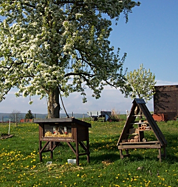 Kleingärtner sind gute Gastgeber. Sie laden nicht nur Freunde und Bekannte zur Grillparty ein. Schreberjünger Gerd Wölke von der Kleingartensparte "Glückauf" in Sondershausen hat auch ein schönes "Insektenhotel" errichtet. Die Nützlinge richten sich je nach ihren individuellen Bedürfnissen in den verschiedenen Räumen ein. Da Wildinsekten solitär leben, gibt es auch keine Wächterbienen am "Insektenhotel". Ihre Hauptflugzeit reicht von Ende März bis Ende Mai. Bereits bei 10 Grad Celsius starten die kleinen Flieger. Die Honigbiene sammelt erst bei Temperaturen von 12 bis 15 Grad Honigtau und Pollen. Ihre Befruchtungsarbeit beginnt somit erst wesentlich später, als die der solitären Bienen. Hummeln hingegen sammeln schon ab plus 5 Grad. 31.01.11 / TA Copyright: Thüringer Allgemeine |